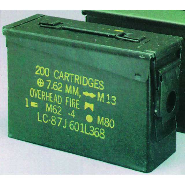 Κιβώτιο πυρομαχικών, ανθεκτικό κιβώτιο πυρομαχικών αμερικάνικου στρατού. Από ισχυρό ατσάλι – αύθραυστο, με πτυσσόμενο χερούλι και κλείσιμο ασφαλείας. Διαθέτει ειδική τσιμούχα για αδιαβροχοποίηση. Ιδανικό για μεταφορά φυσιγγίων 7.62mm και εργαλείων.