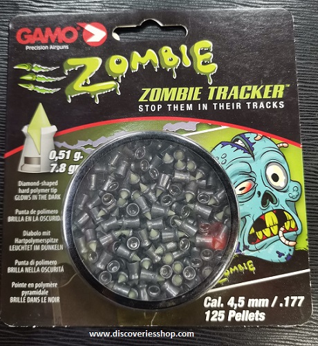 Τα Gamo Zombie Tracker .177 (4,5 χιλιοστά) που φωσφορίζουν στο σκοτάδι, βλήματα αεροβόλου (125 κουτάκι) έχουν μία σκληρή μύτη από πολυμερές σε σχήμα διαμαντιού που λάμπουν έντονα στο σκοτάδι για εύκολη προβολή κατά τη γέμιση και τη σκοποβολή σε συνθήκες χαμηλού φωτισμού.